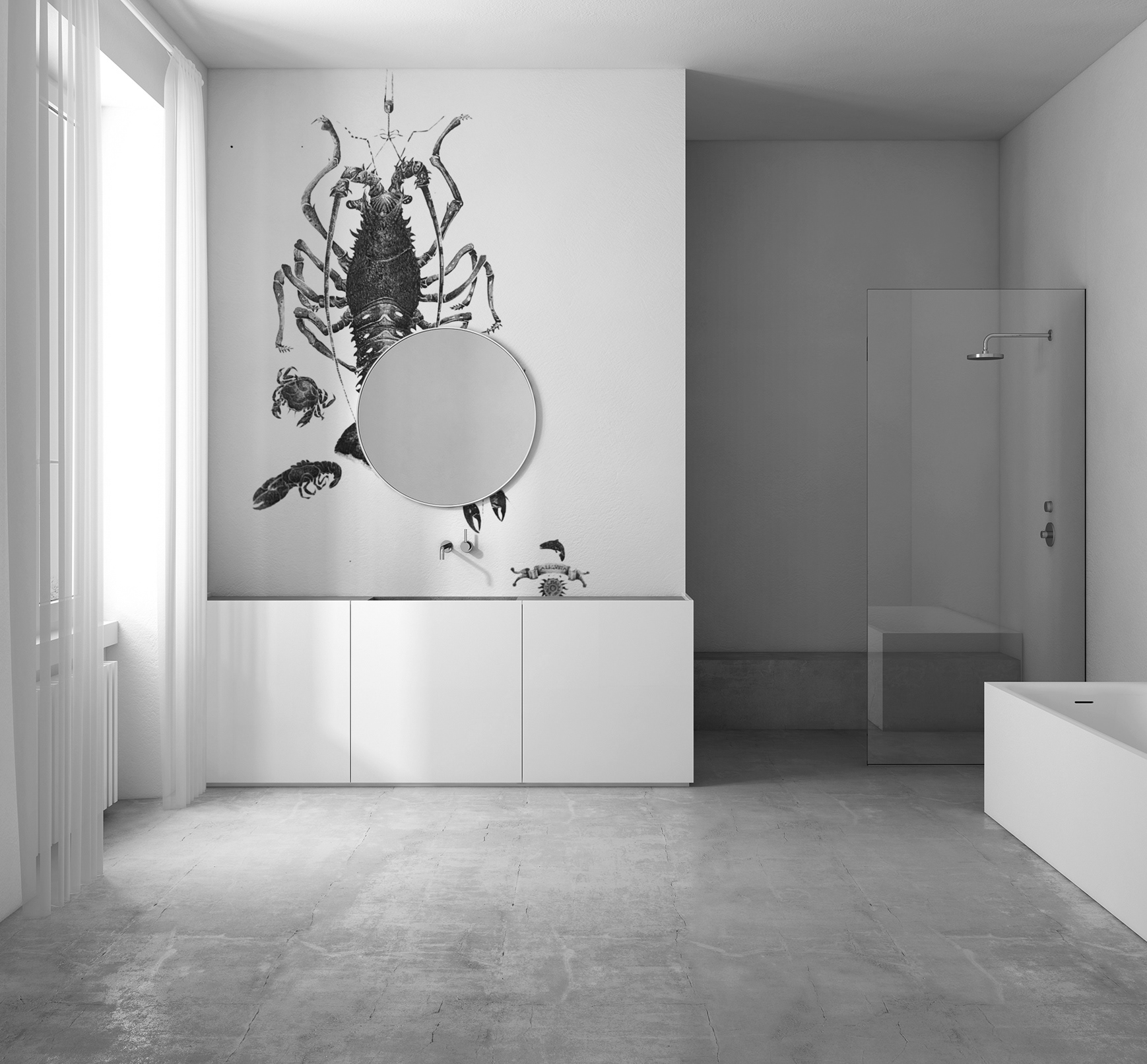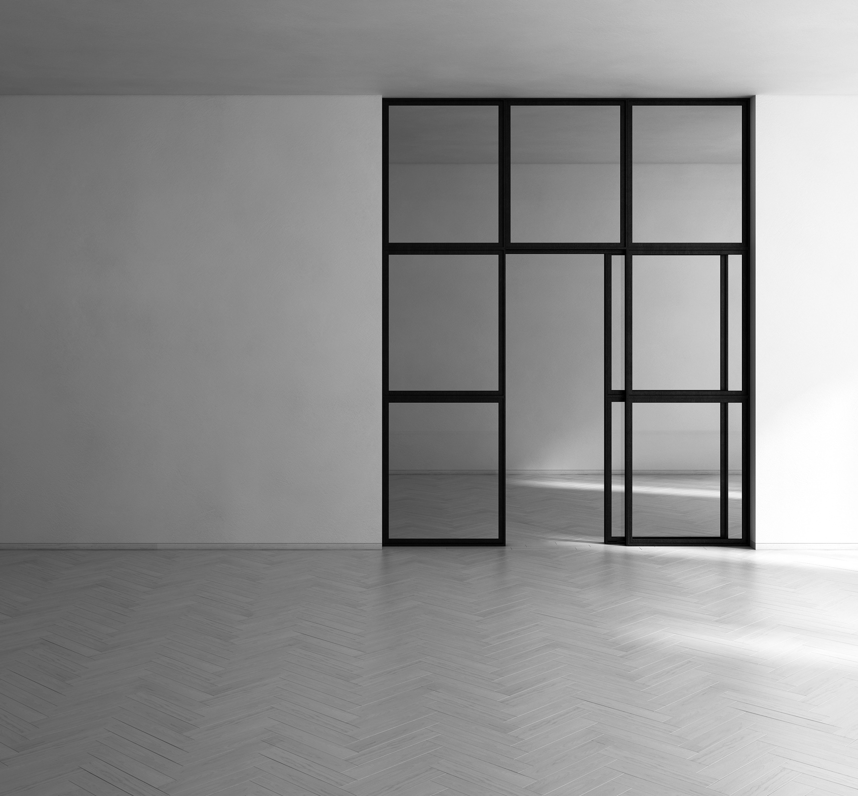 The light-shade herringbone parquet in maple wood together with the white walls and curtains are in contrast with the large black iron doors and dark contemporary furniture.