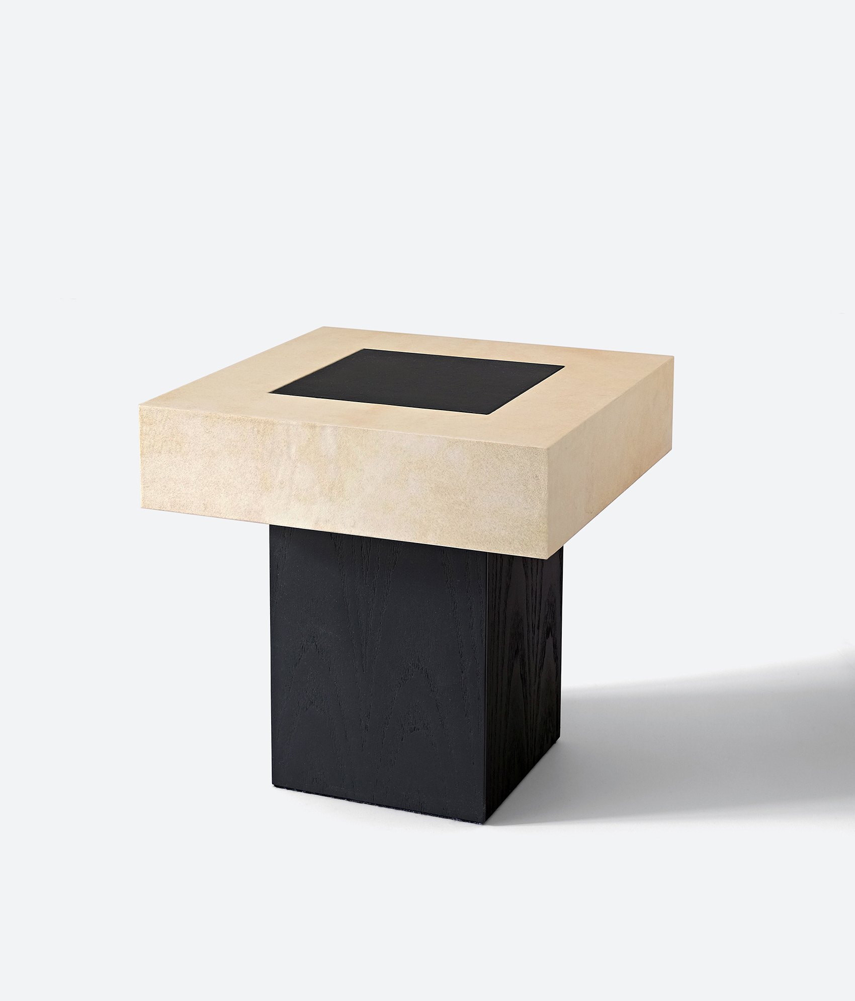 Side table with top handcrafted in natural and black goat parchment and wooden base tinted black. The clear parchment is tanned in its natural color as the darkest is dyed in black. Being parchment a natural material, imperfections are to be considered intrinsic characteristics of the product and expression of its unique and artisanal character.