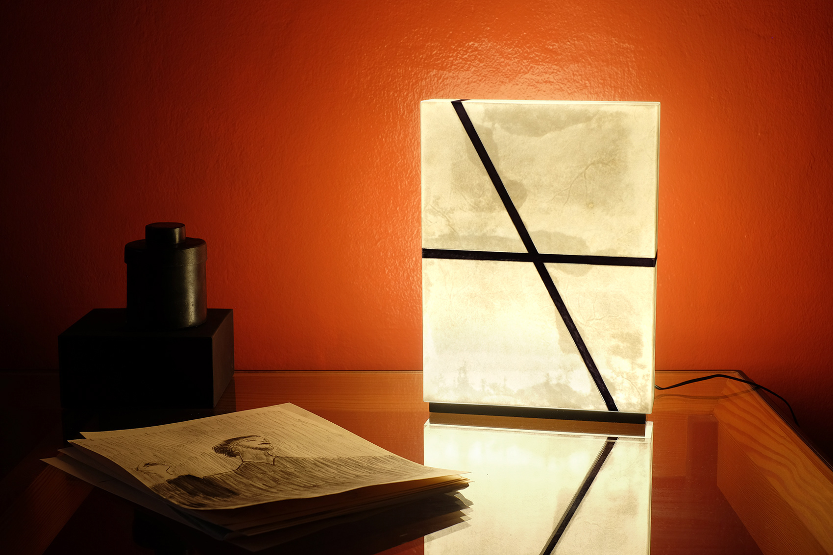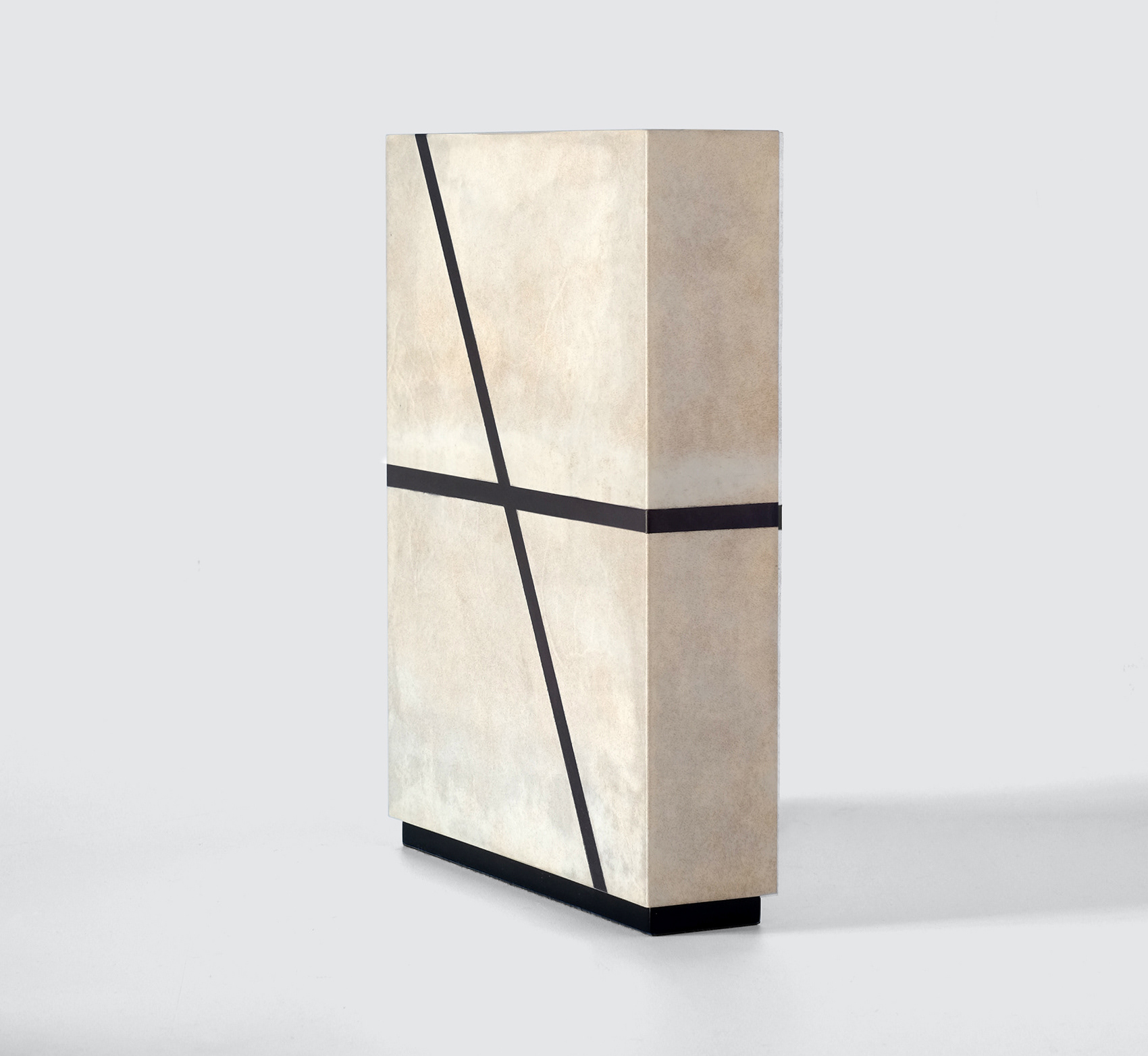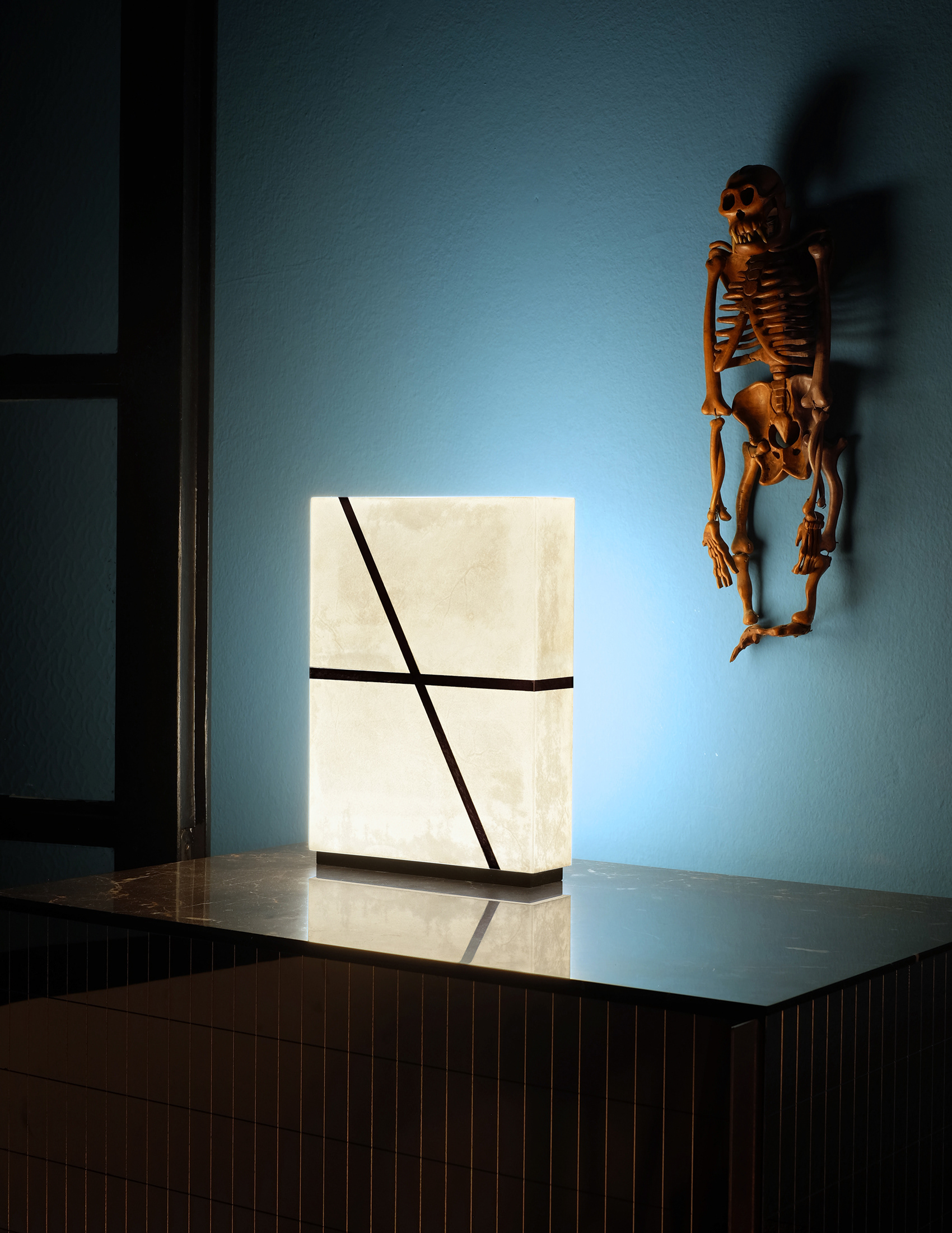 Sculptural table lamp handcrafted in natural goat parchment. Black geometric motif inked on the surface.