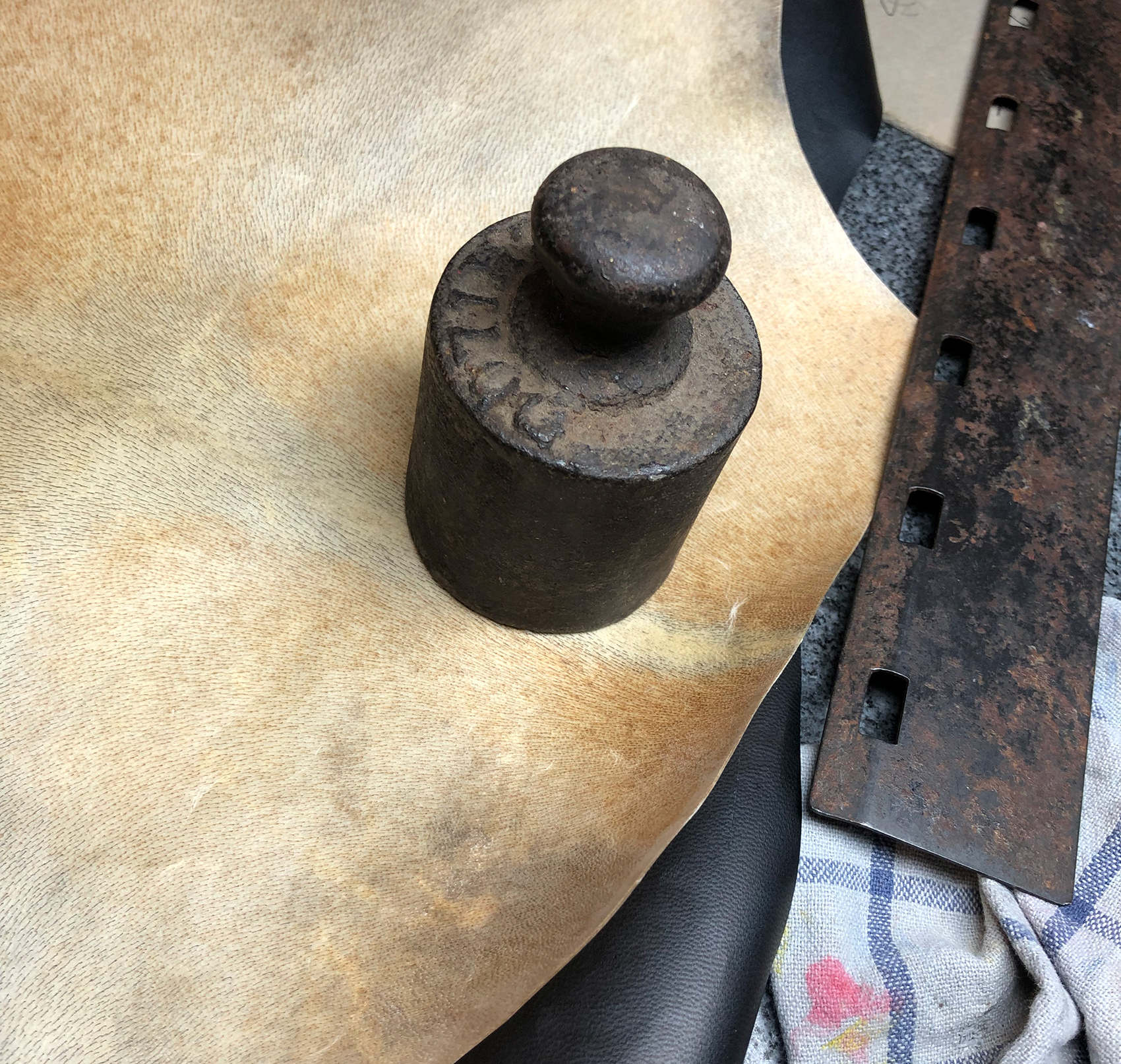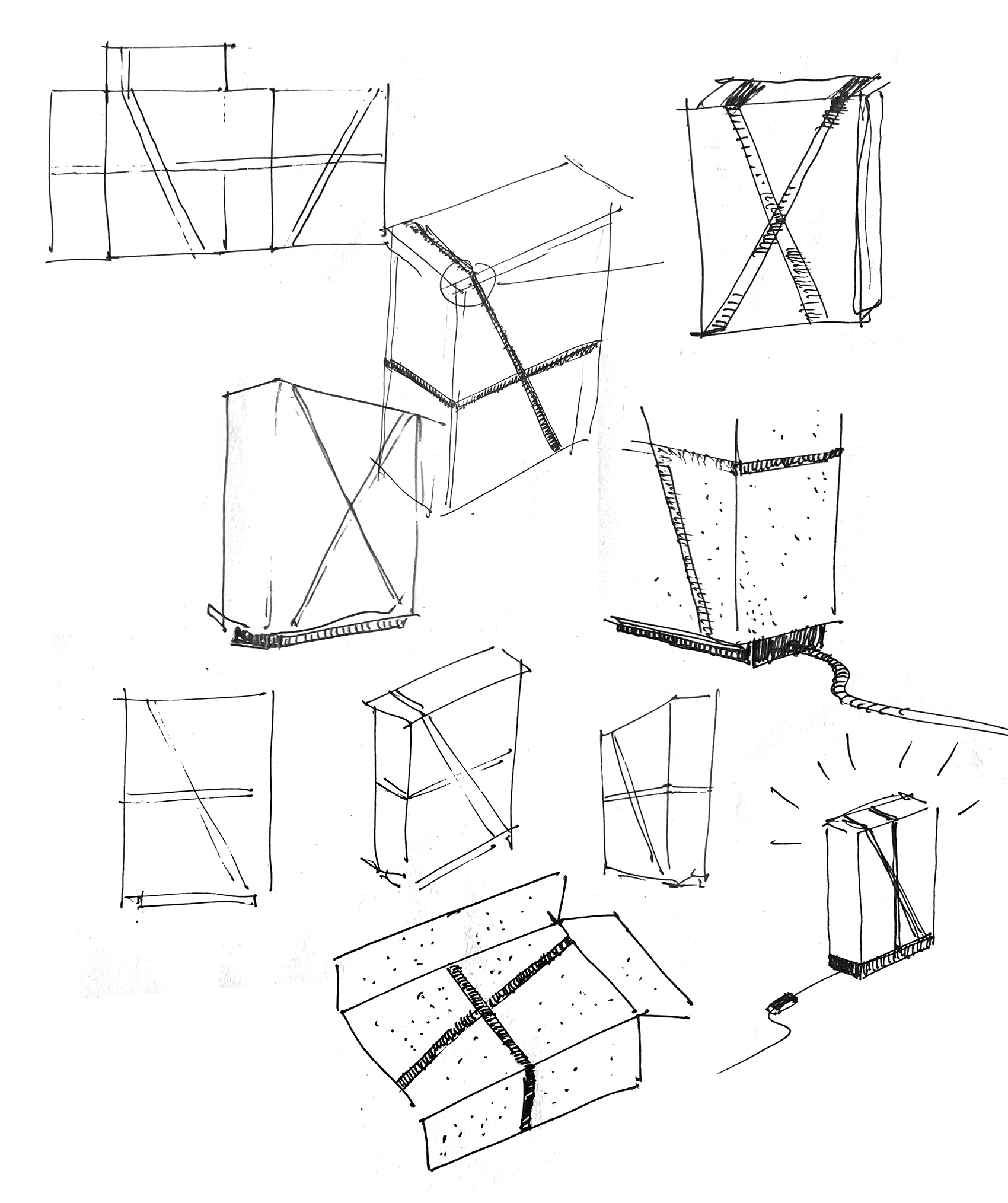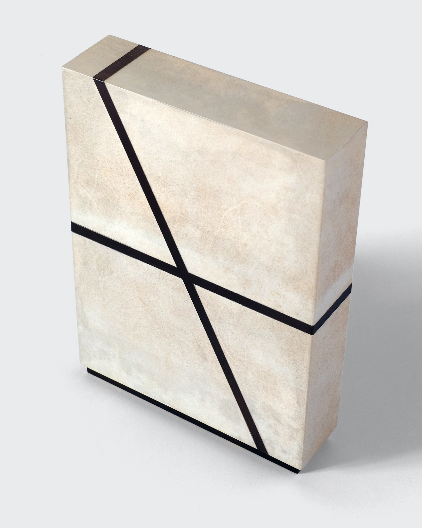 Sculptural table lamp handcrafted in natural goat parchment. Black geometric motif inked on the surface.