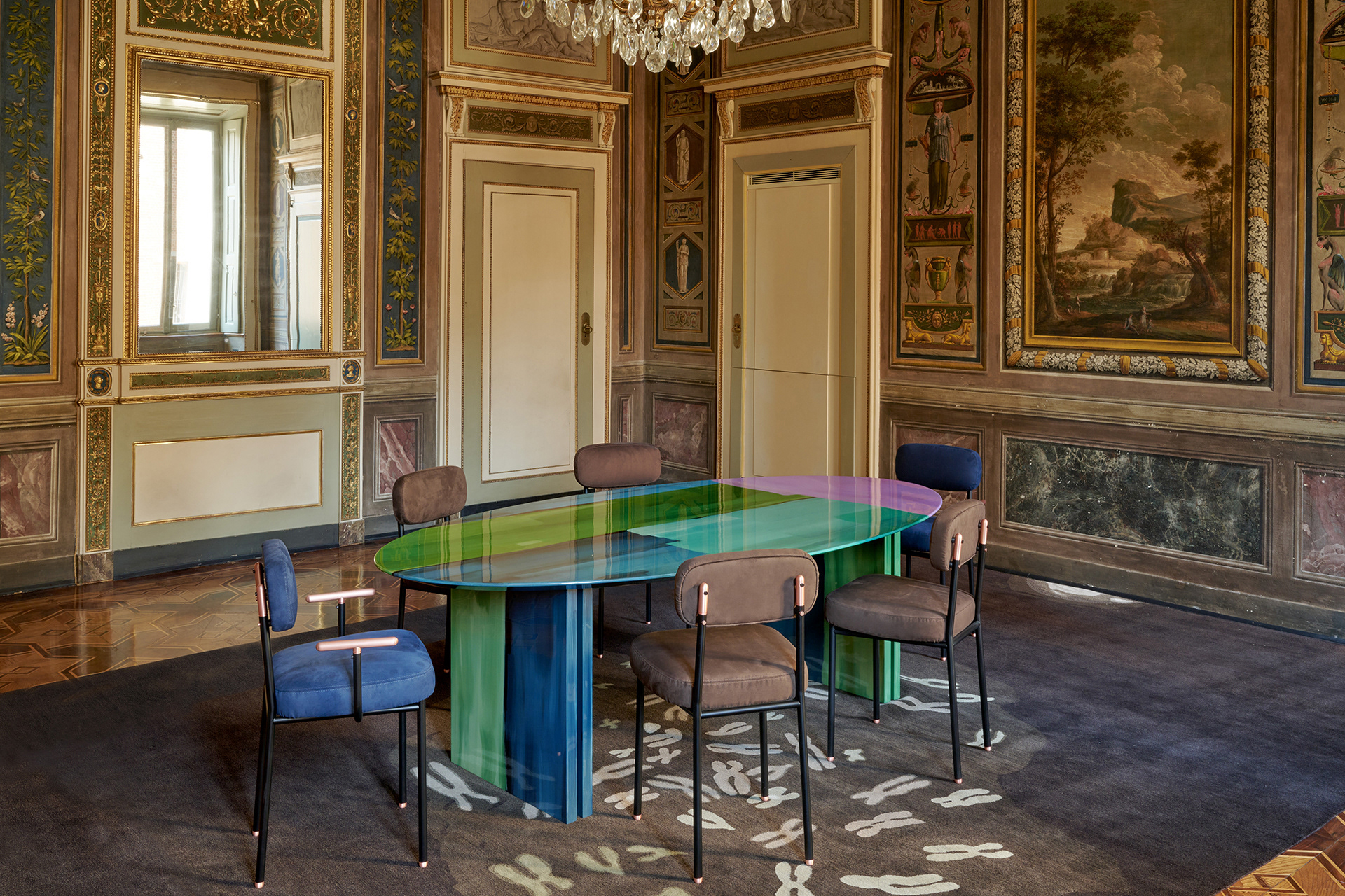 Mensa is part of a 6 pieces collection called New Pompeii where the furniture is entirely hand-painted with acrylic colors by me through a multiple layering process. A variety of tones of the same color are applied onto each other creating countless chromatic variations and revealing previous phases of the process. Different drying stages of the acrylic paint are visible through sudden interruptions and smoother blending.