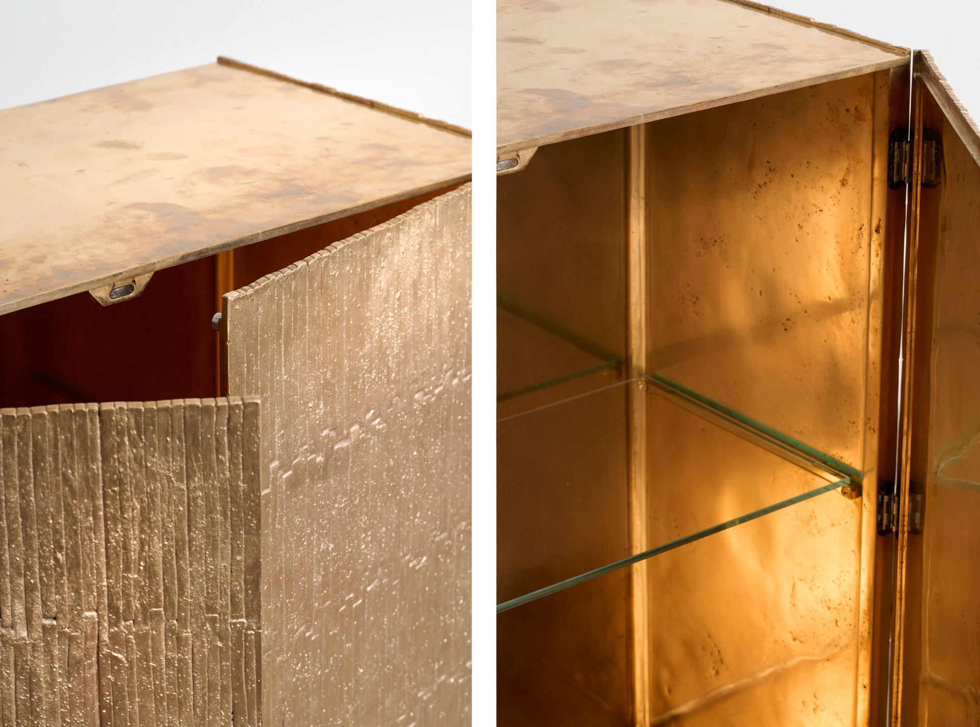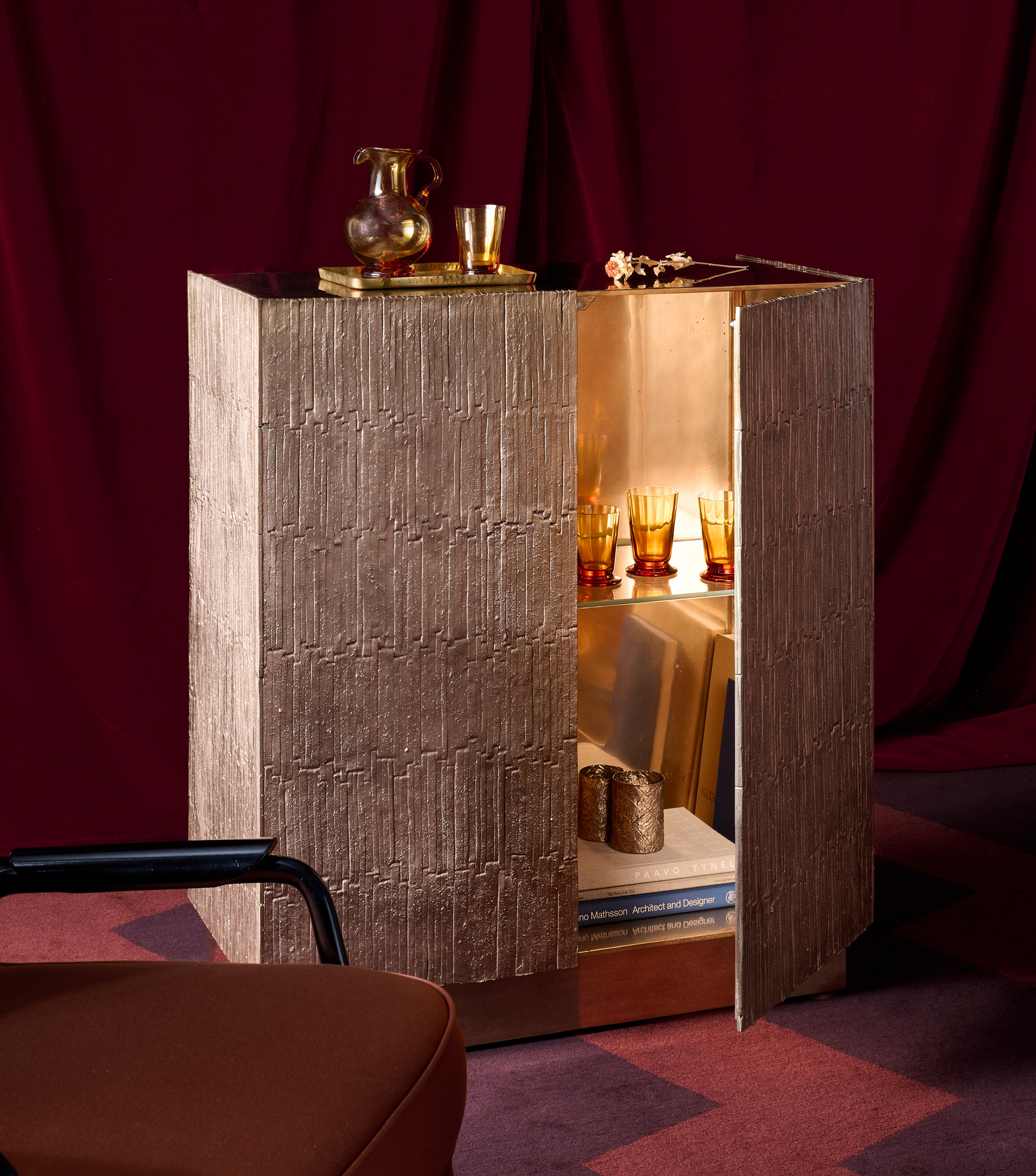 Sole is part of Muse, a collection of furniture crafted entirely from solid sand-cast bronze, exclusively showcased at Nilufar Gallery. The aesthetic language recalls celestial bodies in a primordial representation. Sun, Moon, Stars. All the original models for casting were made entirely by me in clay, reflecting an instinctive portrayal of the subjects. The modeling of the pieces is deliberately rough; the intention is to represent objects that have withstood the passage of time. The legs of the tables echo the geometry of ancient astronomical instruments, while the raffia of the Knossiana lampshades intentionally recalls a natural and primitive element that complements the metallic forms. A defining characteristic of the collection is its use of contrasting finishes. Some pieces retain their natural bronze finish, highlighting the material’s inherent beauty and evoking a solar presence, while others present a dark, nocturnal patina in deep shades of blue and green. Declined in an array of unique objects, the collection includes tables, side tables, mirrors, lamps, a console and a cabinet. This collection has been brought to life through the invaluable support, skills and dedication of Davide Campagner, his son Alessandro and the entire team at Fonderia Artistica Campagner.